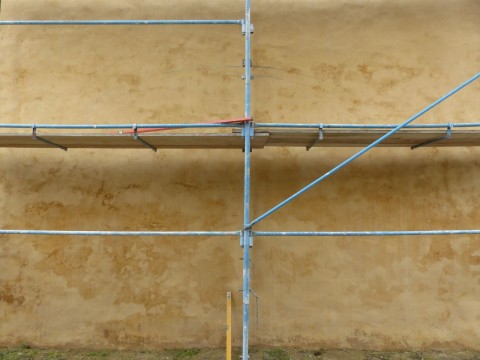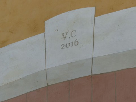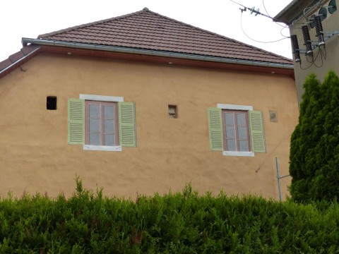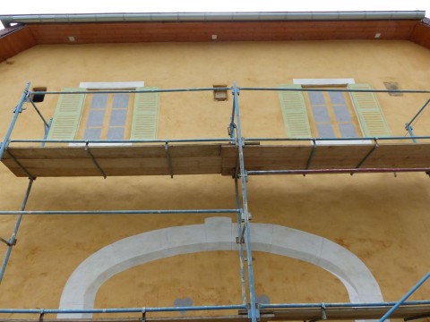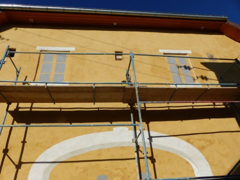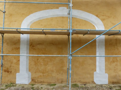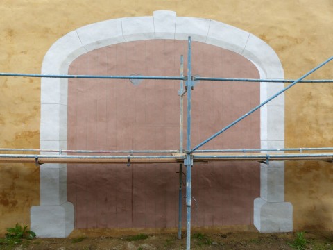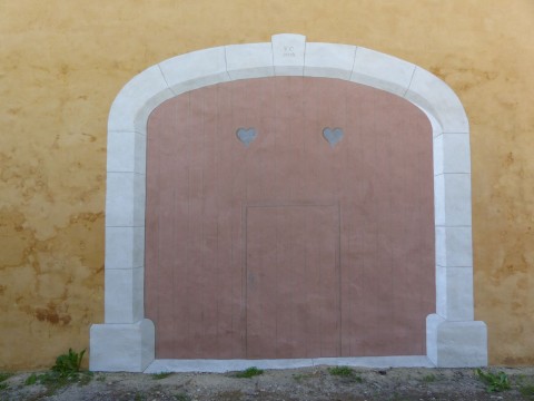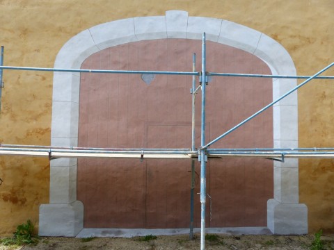 Réalisation en pignon d’une porte de grange et de deux fenêtres en peinture à la chaux , sur un enduit à la chaux réalisé à Sirod en 2015 .