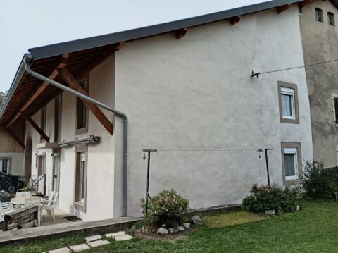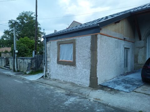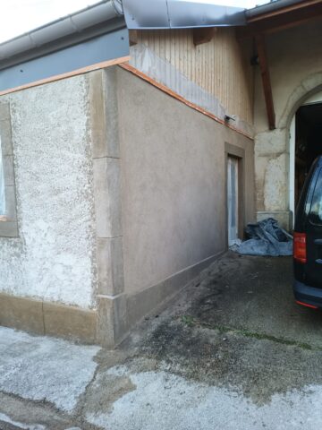 • sur l’annexe : création de fausses pierres en ciment prompt et sable 0/2 mm au niveau des encadrements de fenêtres et de la porte, sur le chaînage d’angle et en sous bassement, enduit de finition en chaux hydraulique NHL3,5 sable 0/2 mm et badigeon écru