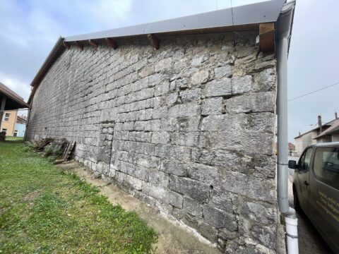 • sur le mur pignon en pierres nues : rejointoiment entre les grosses pierres de taille