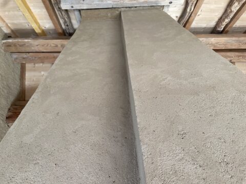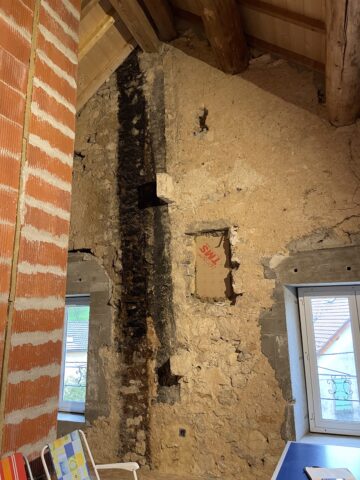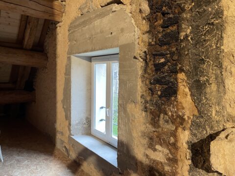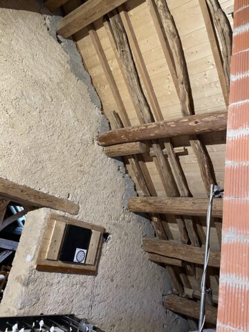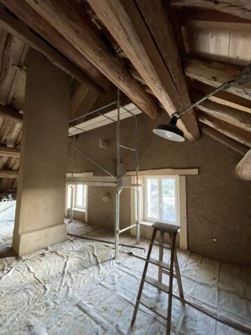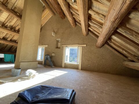 Sur le mur de refend en pignon, un bandeau d’enduit vient boucher les trous sous les grosses pannes et créer un ruban décoratif.