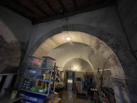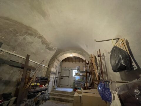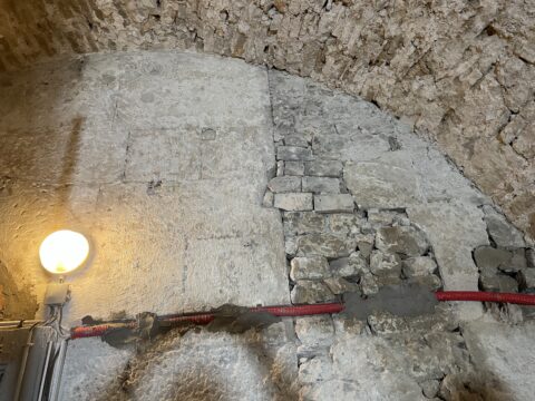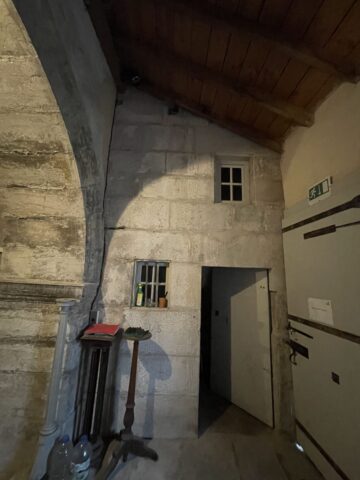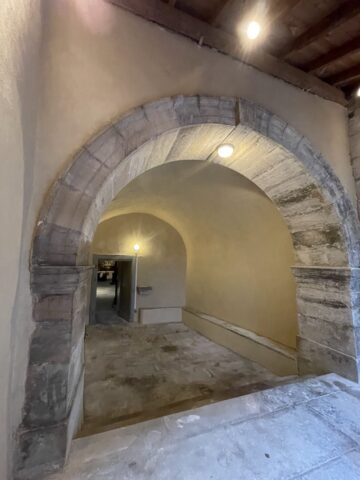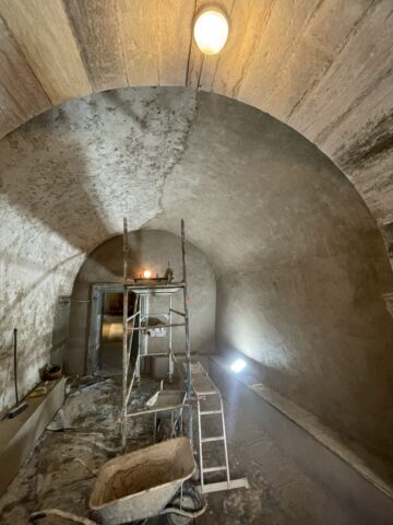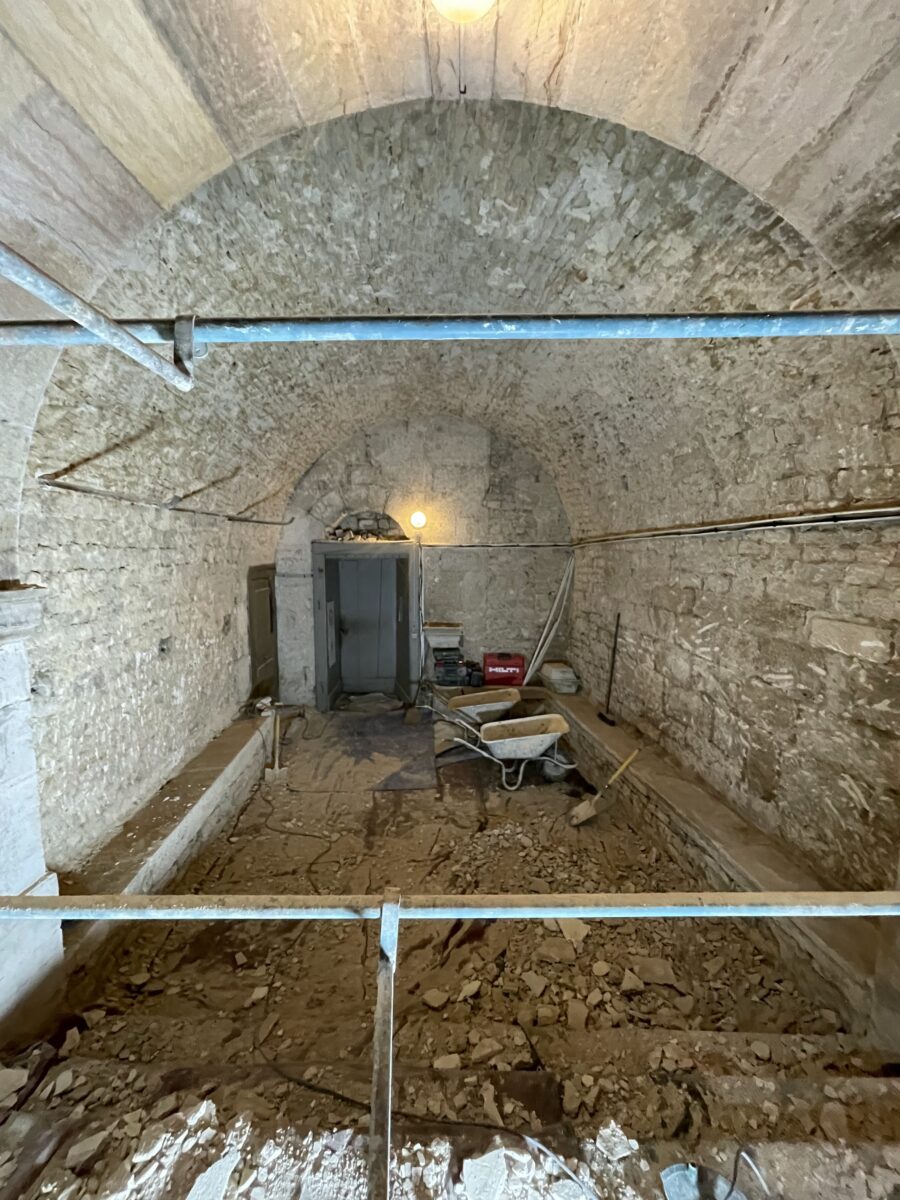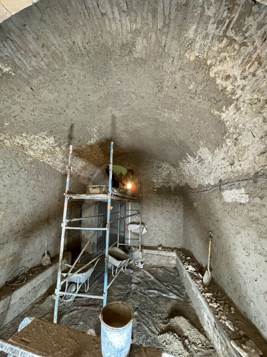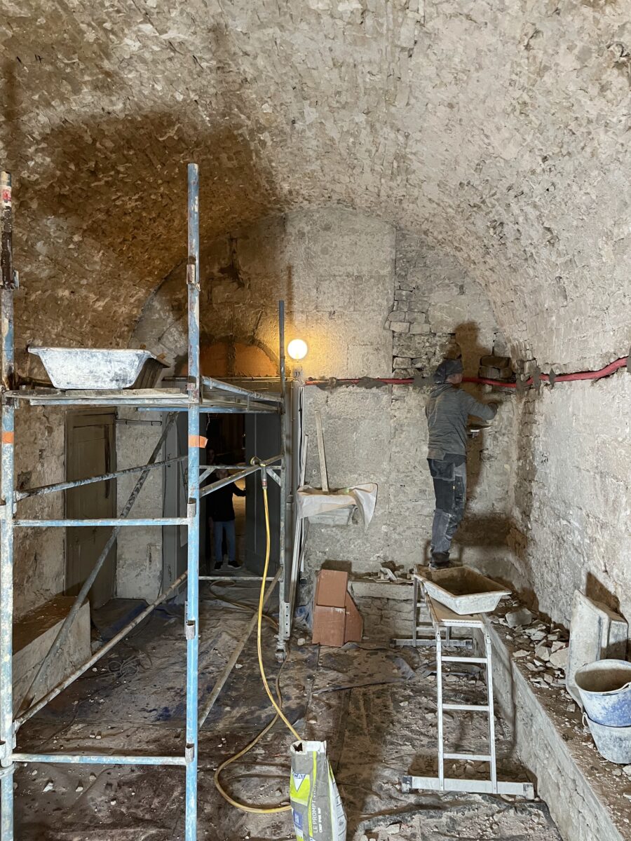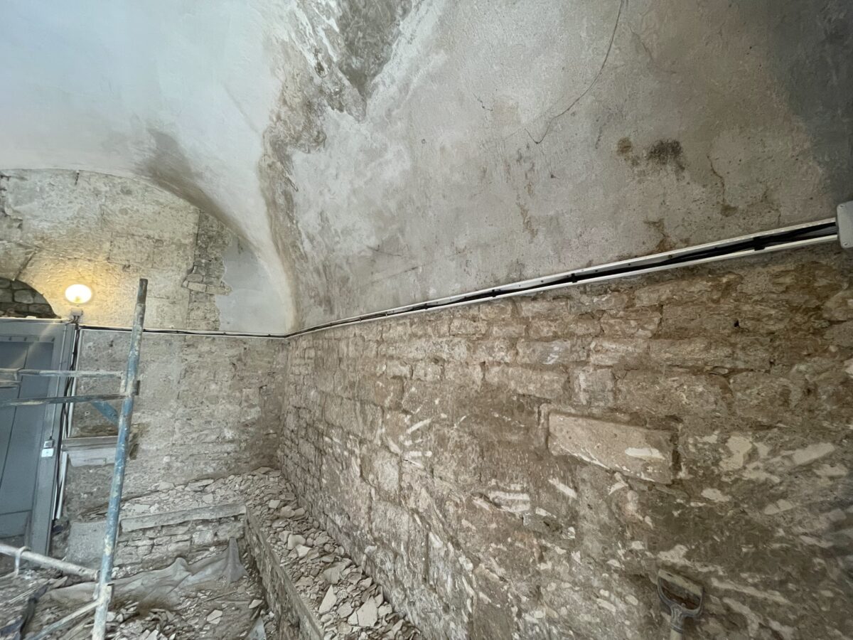 Les murs de la salle voûtée étaient couverts en grande partie par des vieux enduits au plâtre mais aussi par des enduits au ciment non respirant créant une humidité permanente dans en bas de mur.