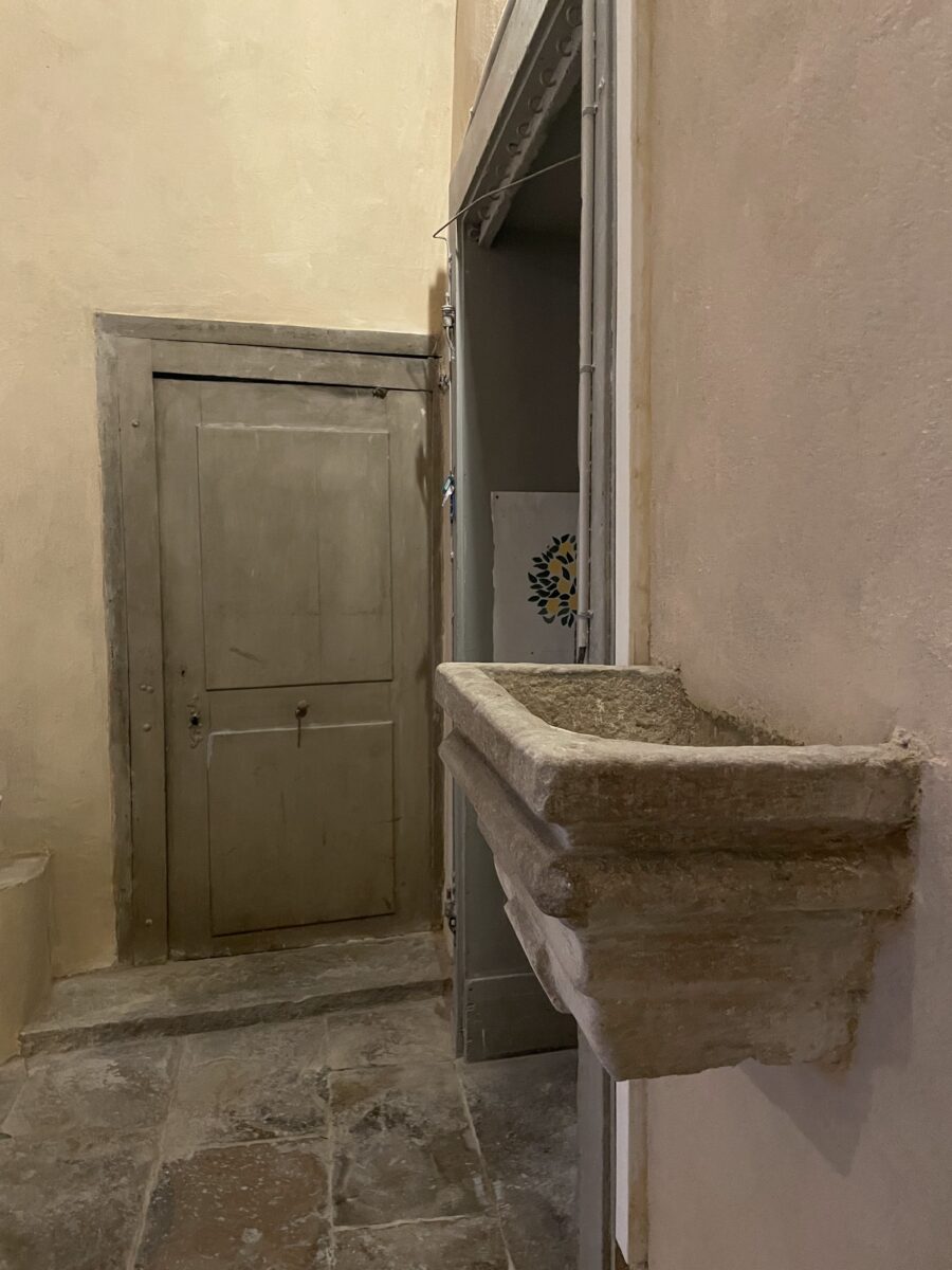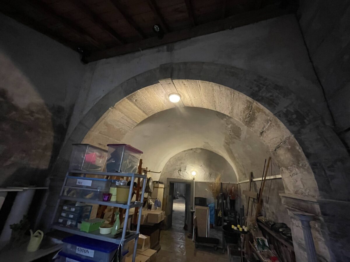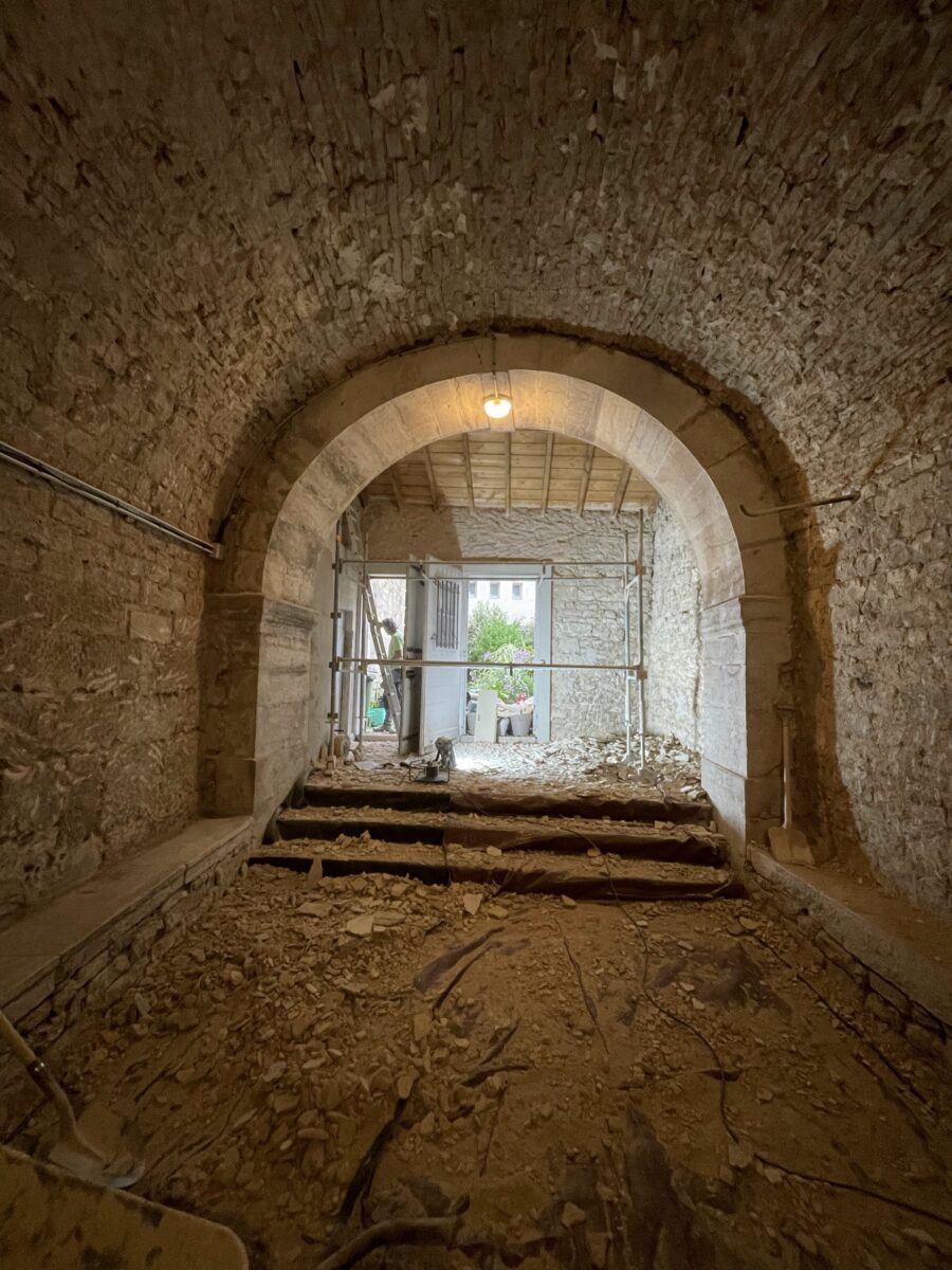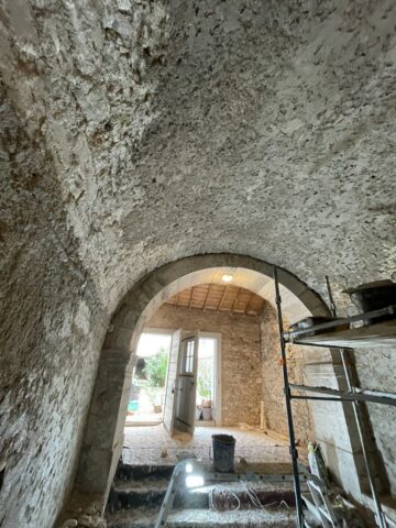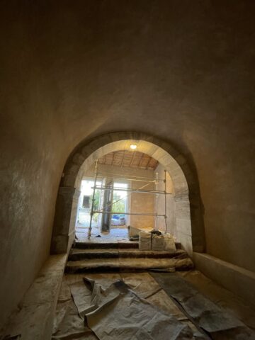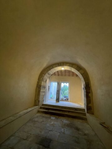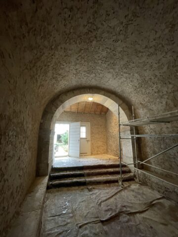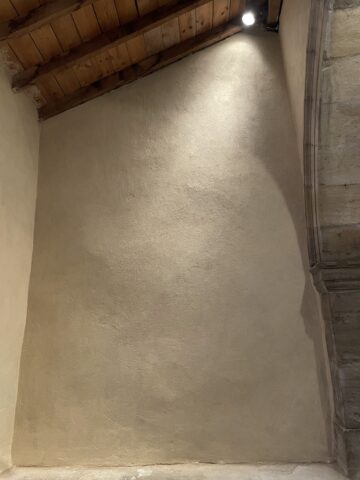 L’ensemble des mur a été décroûté puis rempoché puis enduit. Un badigeon légèrement teinté avec de l’ocre jaune clair a été appliqué au final.