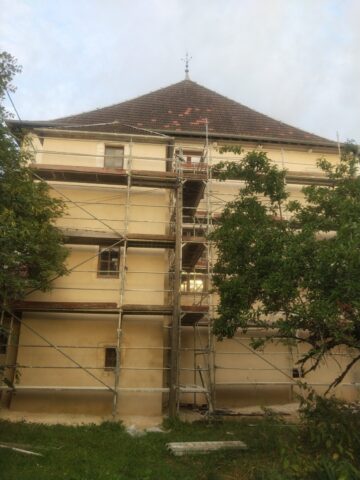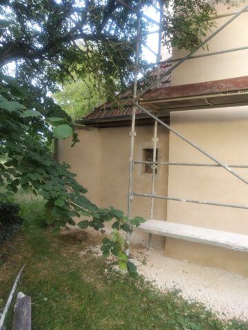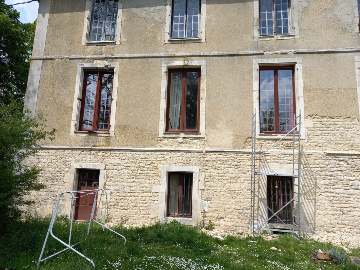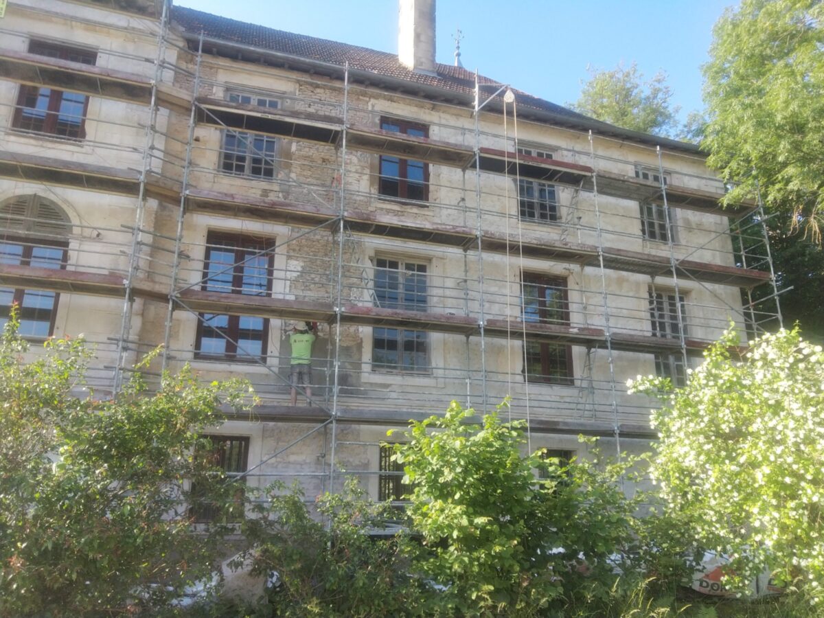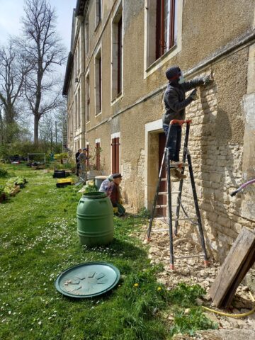 Suite à un gros travail remarquable de décroûtage des murs réalisé par les bénévoles de l’association, les enduits ont été restitués sur deux années( 2 x 4 semaines), en respectant les étapes suivantes : rempochage des joints creux, réparation des pierres d’encadrement et de corniches, enduits de finition réalisées avec de la chaux en pâte puis badigeon teinté en deux couches.
