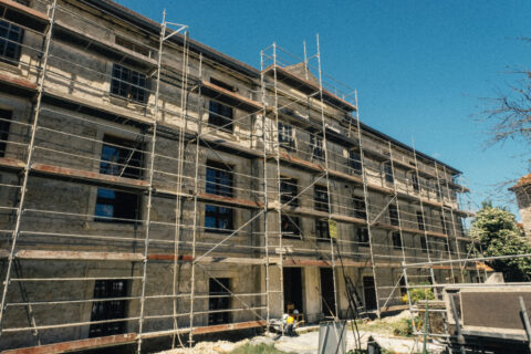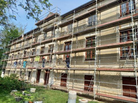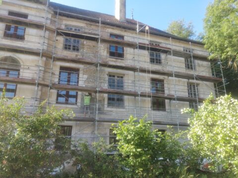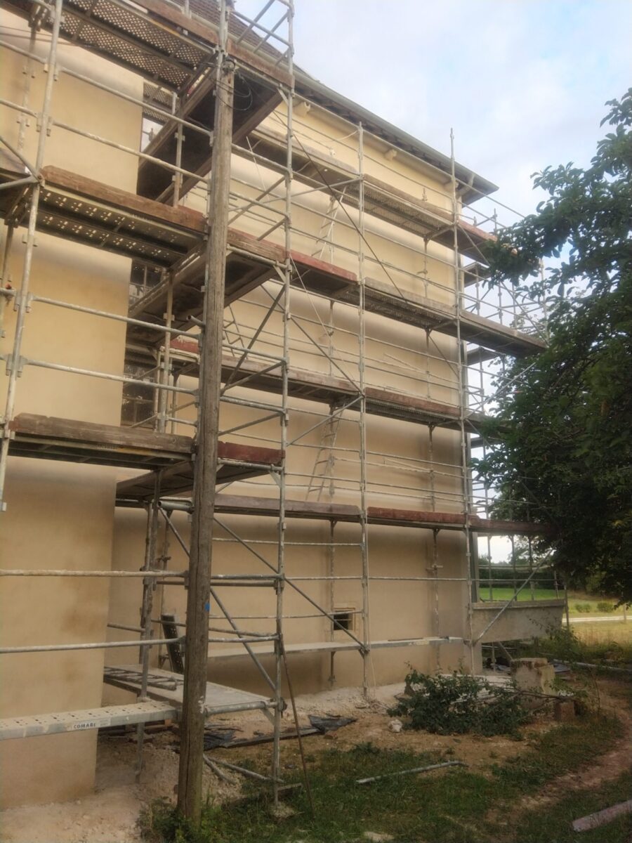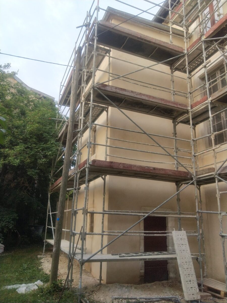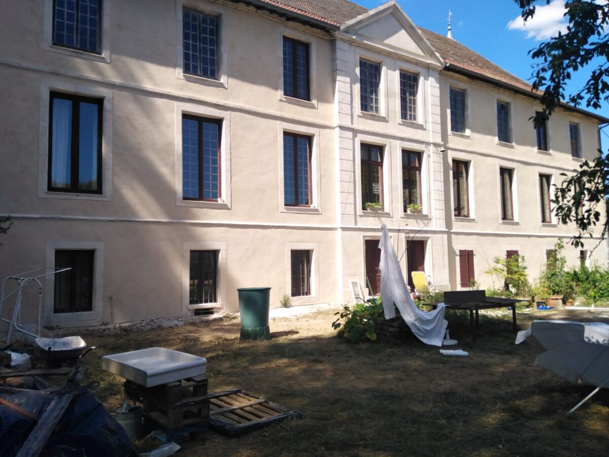 Suite à un gros travail remarquable de décroûtage des murs réalisé par les bénévoles de l’association, les enduits ont été restitués sur deux années( 2 x 4 semaines), en respectant les étapes suivantes : rempochage des joints creux, réparation des pierres d’encadrement et de corniches, enduits de finition réalisées avec de la chaux en pâte puis badigeon teinté en deux couches.