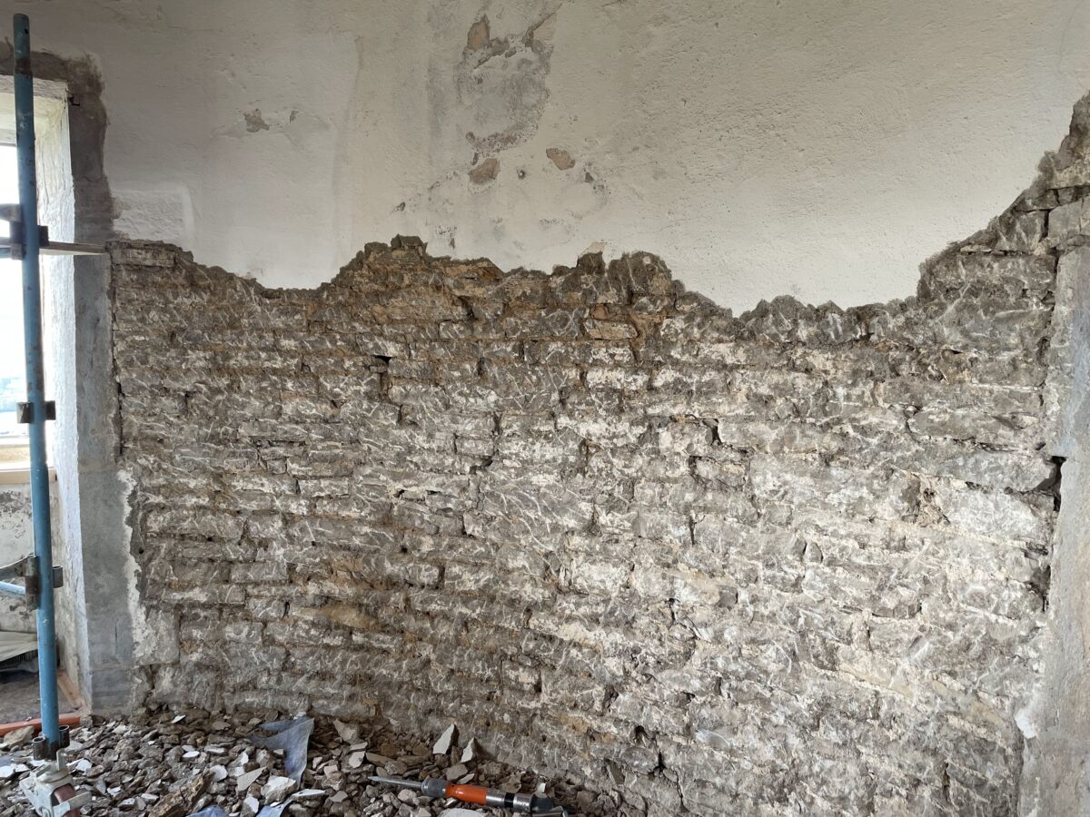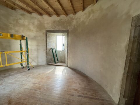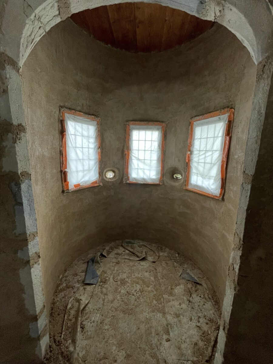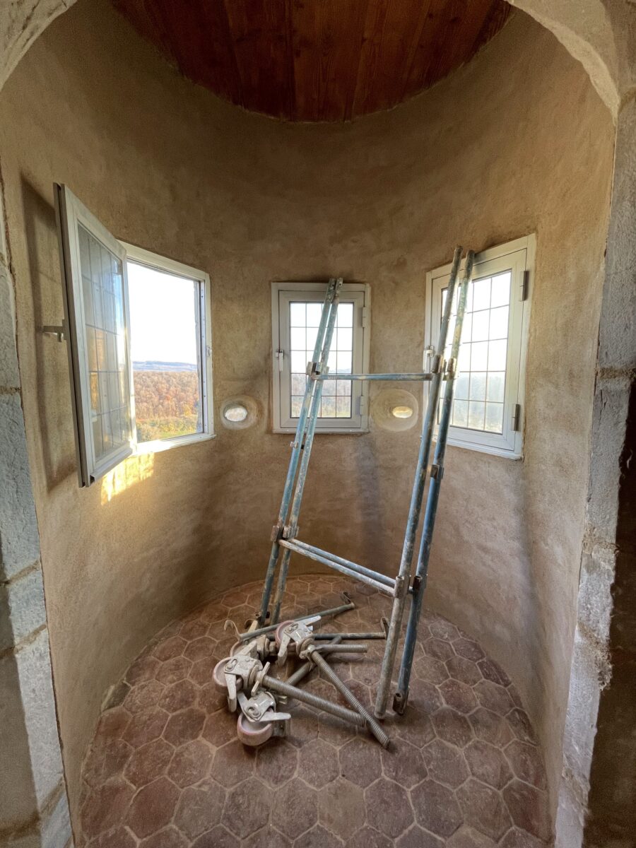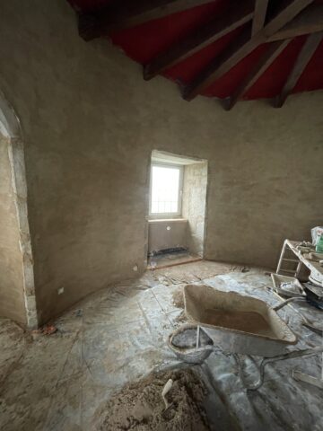 Les murs intérieurs de la tour ronde avaient été enduits avec un mortier au ciment et peint avec une peinture acrylique. Cela provoquait des problèmes d’humidité dans les deux pièces.