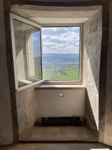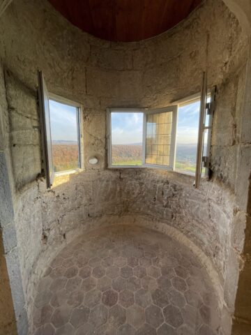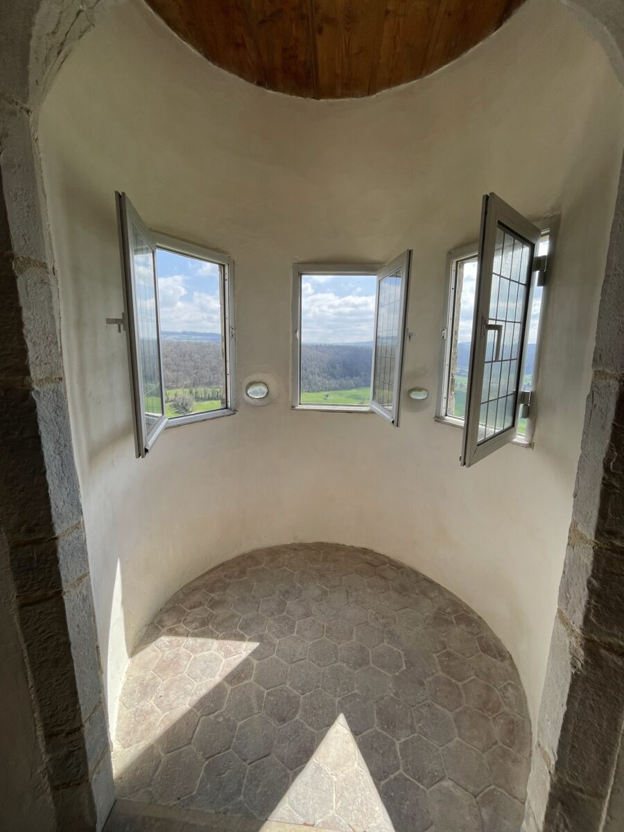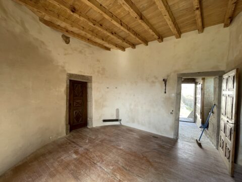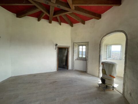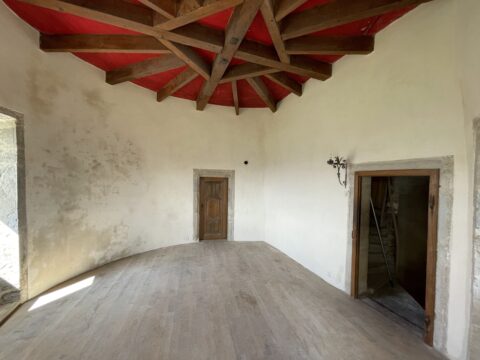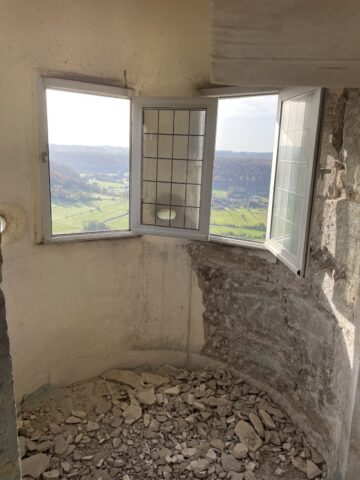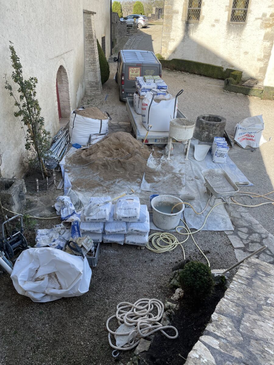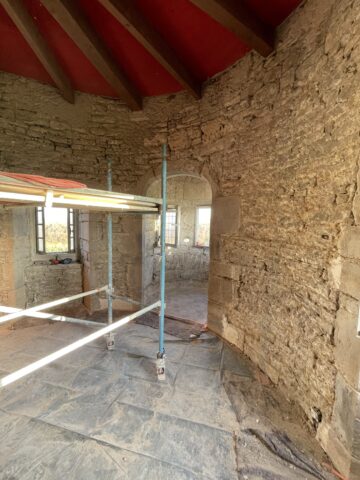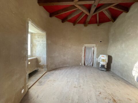 Les murs intérieurs de la tour ronde avaient été enduits avec un mortier au ciment et peint avec une peinture acrylique. Cela provoquait des problèmes d’humidité dans les deux pièces.