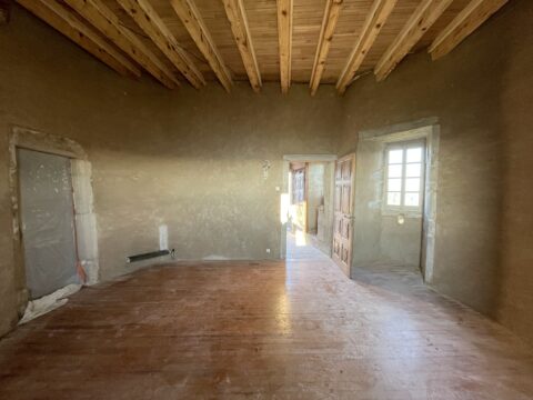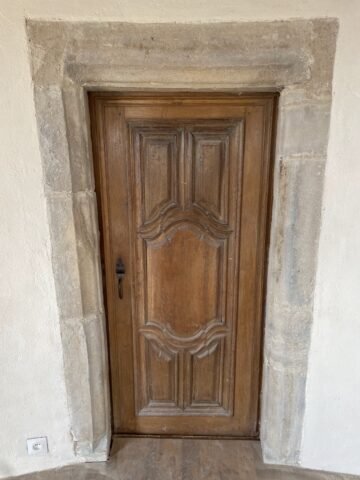 Après un décroûtage de l’enduit ciment, un rempochage a été réalisé pour redonner de la planéité aux murs. Puis un enduit de finition à la chaux aérienne et sable 0/2 mm taloché/serré a été appliqué. après séchage complet, un badigeon écru en 2 passes est venu couvrir l’enduit.