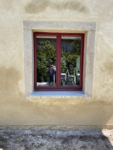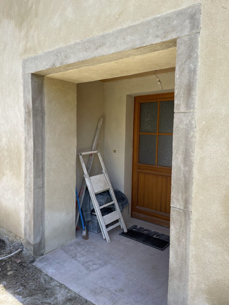 Aucun problème d’humidité n’étaient présents dans la maison. Le choix a été fait de décroûter le pied de mur sur 80 cm de haut uniquement puis d’enduire sur les enduits existants. Un gobetis a permis de recréer une accroche générale. Toutes les ouvertures nouvelles ont été habillées d’un enduit de fausse pierre en ciment prompt et sable 0/2 mm. Un enduit de finition teinté dans la masse avec de l’ocre jaune foncé.