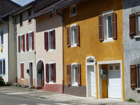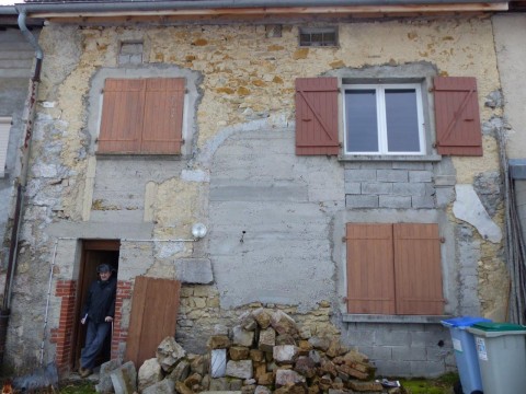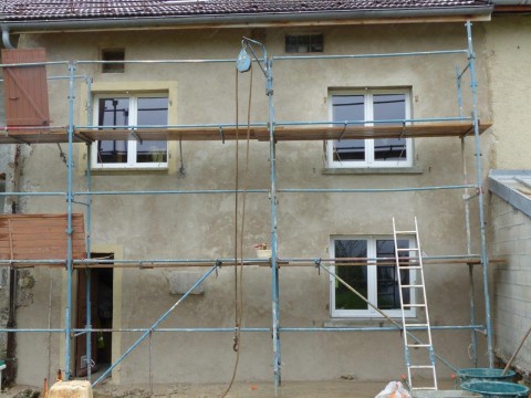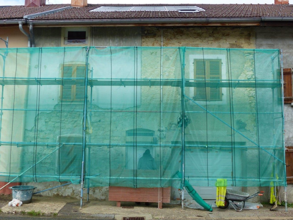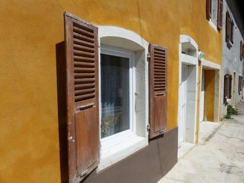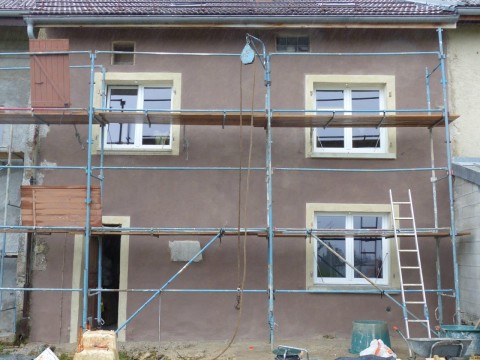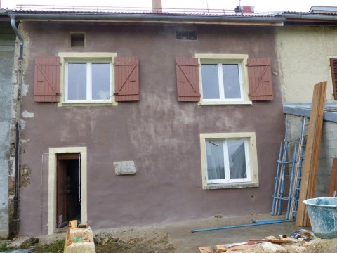 Une maison en mitoyenneté, réunissant deux petits logements, présentait des façades dépareillées suite à des modifications d’ouverture et reprises d’enduit. Côté rue, la gaine électrique qui descendait le long de la façade a été noyée dans l’enduit. Des pigments ocre jaune ont été appliqués à fresque sur l’enduit de chaux aérienne. Côté jardin, un enduit mixte de chaux aérienne et hydraulique a reçu un badigeon terre d’ombre calciné tandis que les encadrements de baie sont soulignés par une couleur ocre jaune clair.
