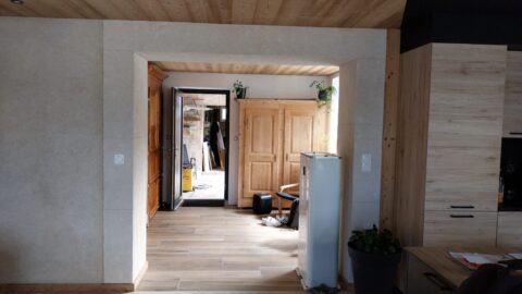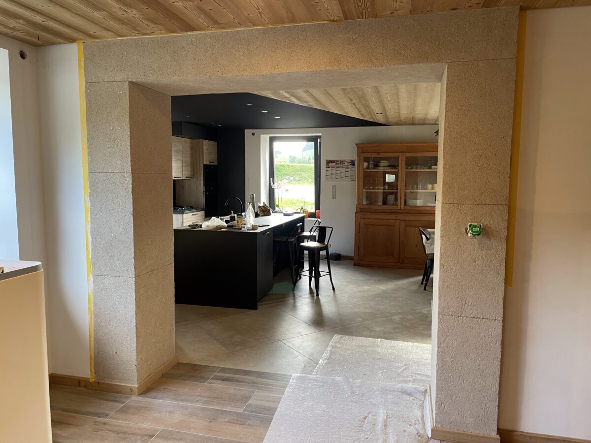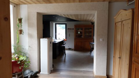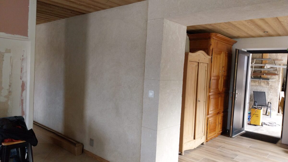Un enduit de fausse pierre à base de plâtre, de chaux aérienne et de sable a été mis en oeuvre sur l’encadrement de passage entre les deux pièces.
