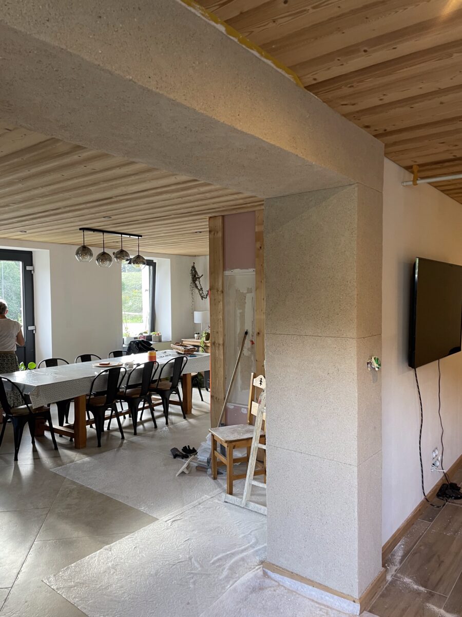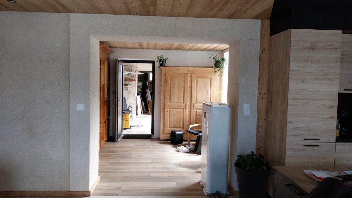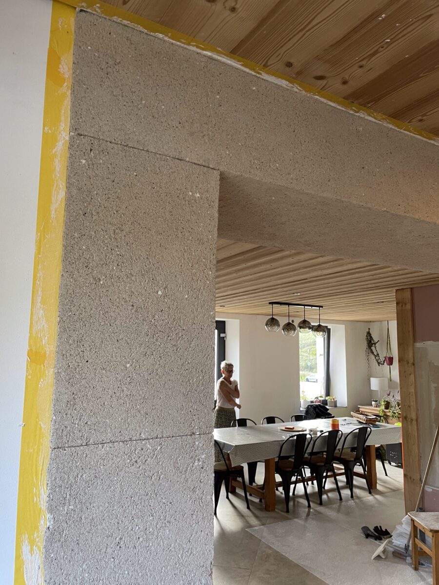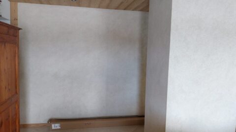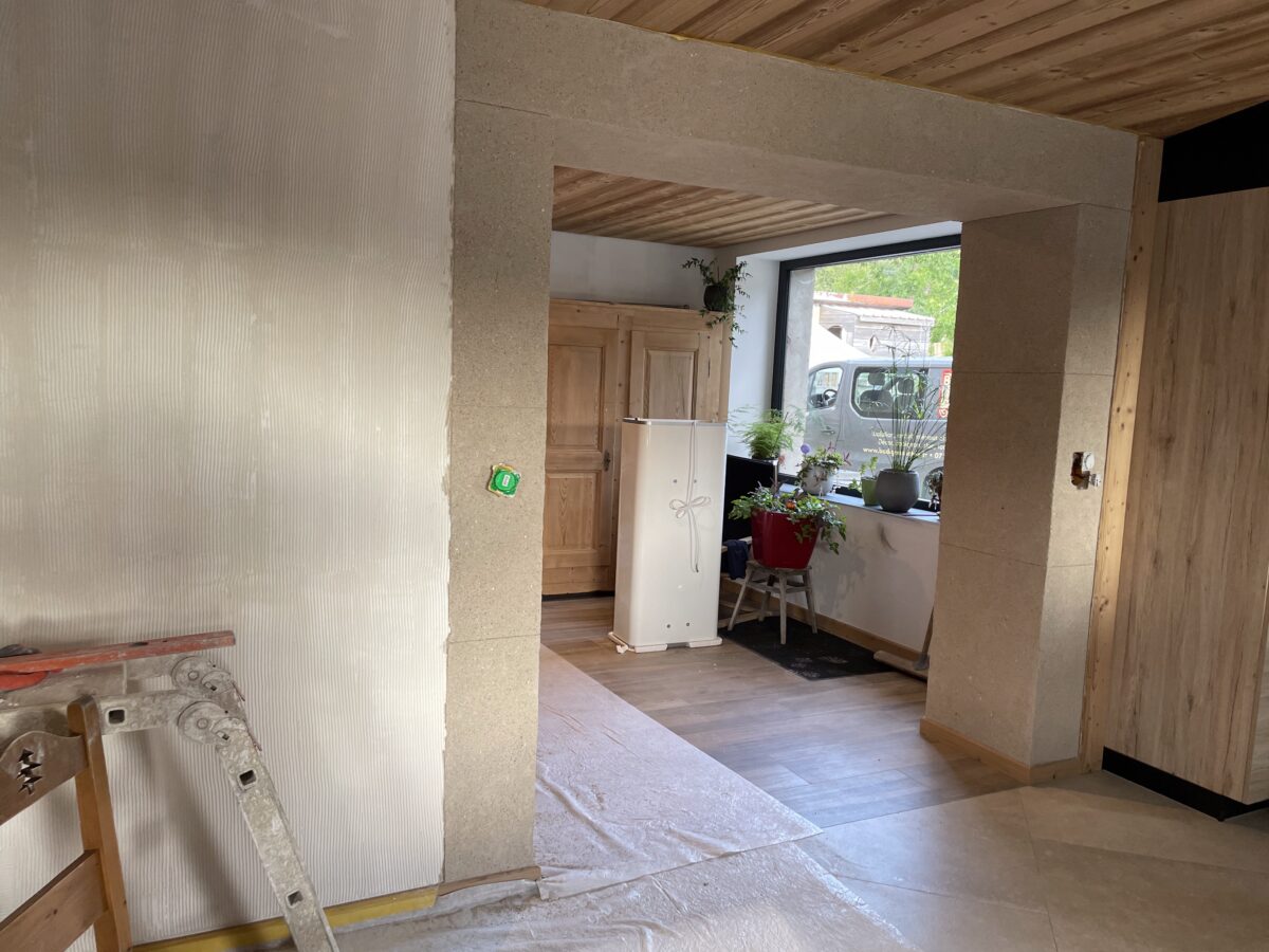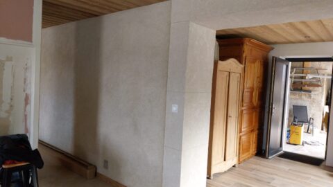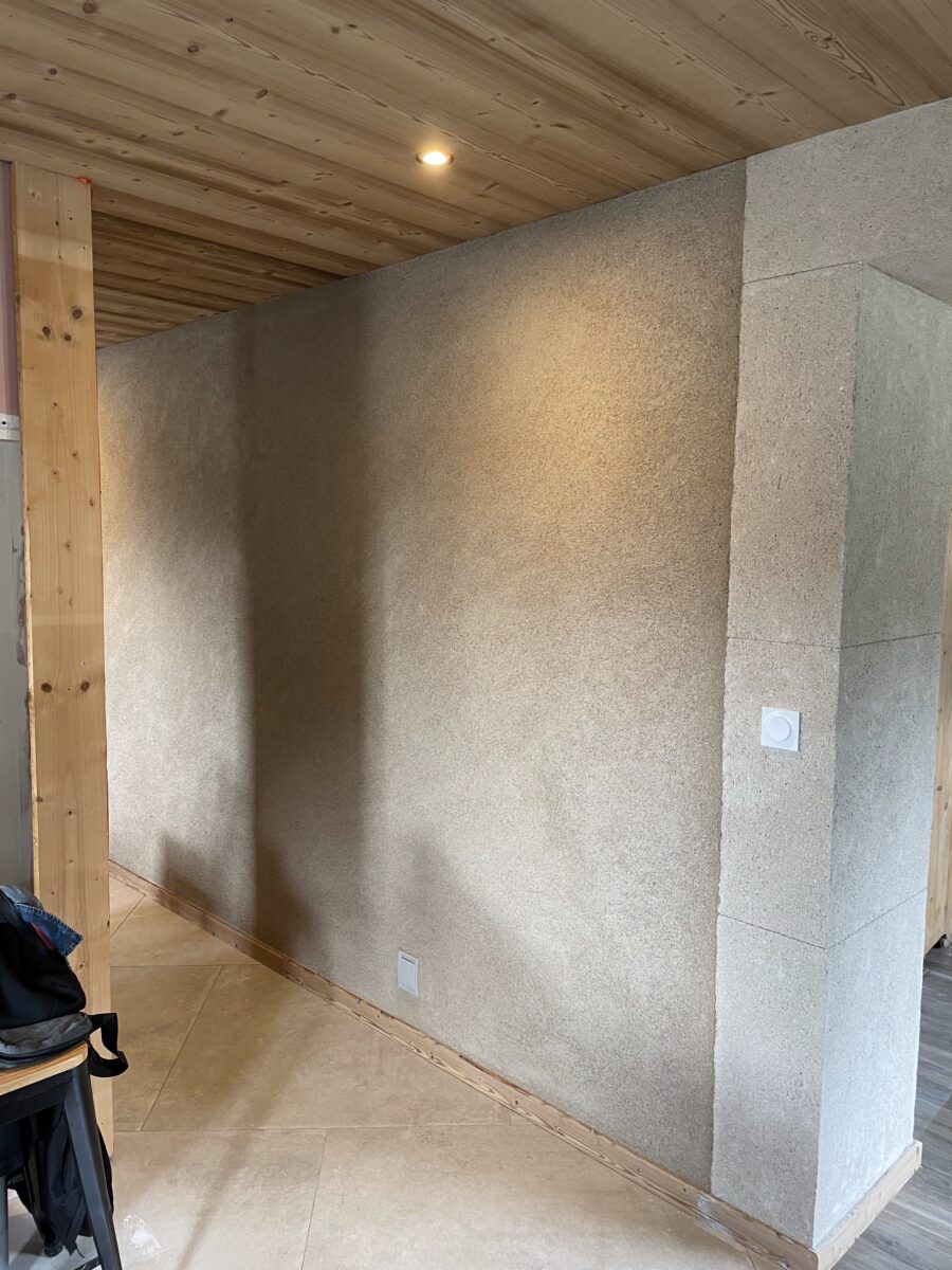 Un enduit de finition chaux aérienne et sable 0/2 mm taloché/serré a été appliqué sur le reste du placoplâtre.