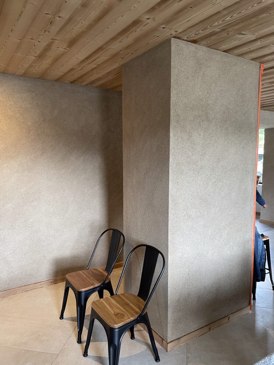 Enduits de finition sur un cabanon avec murs banchés en terre/paille allégé