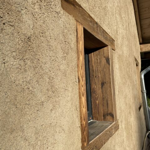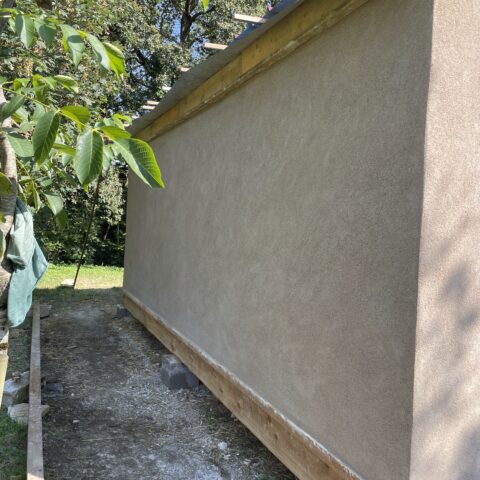 Enduits de finition sur un cabanon avec murs banchés en terre/paille allégé