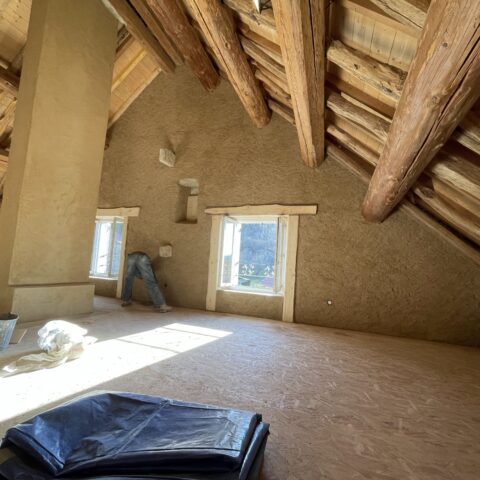 Corps d’enduit en terre/sable dans une maison en bottes de paille