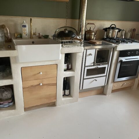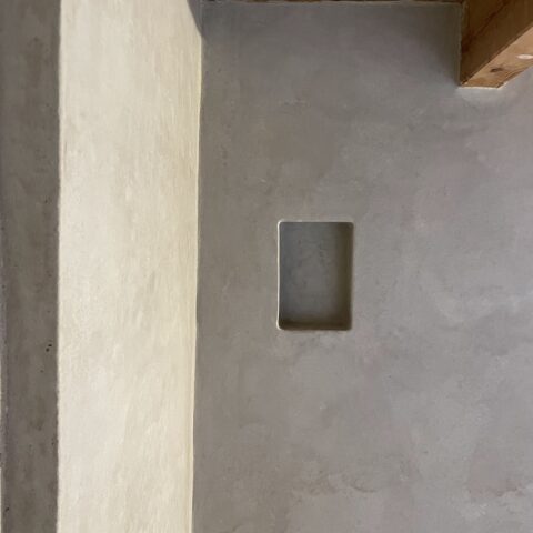 Mur en terre crue et tadelakt dans une maison en ossature bois